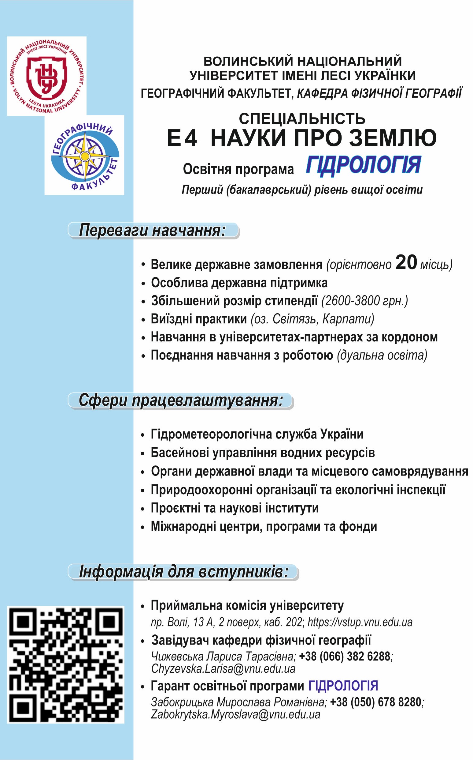 • бакалавра – Е4 Науки про Землю, освітня програма "Гідрологія"; С6 Географія, освітня програма "Географія";