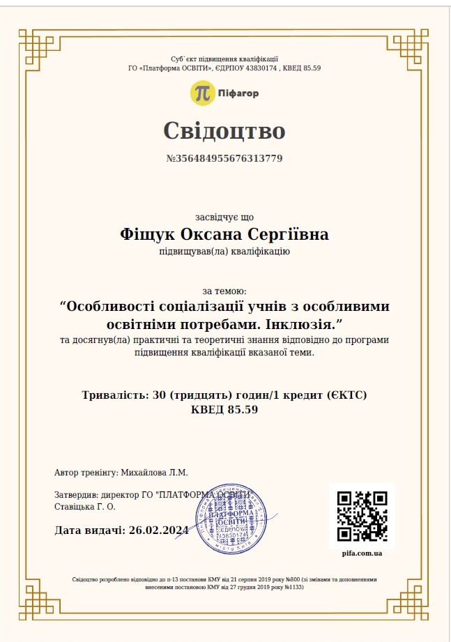 Підвищення кваліфікації за темою «Особливості соціалізації учнів з особливими потребами. Інклюзія» Всеукраїнська наукова онлайн конференція Піфагор