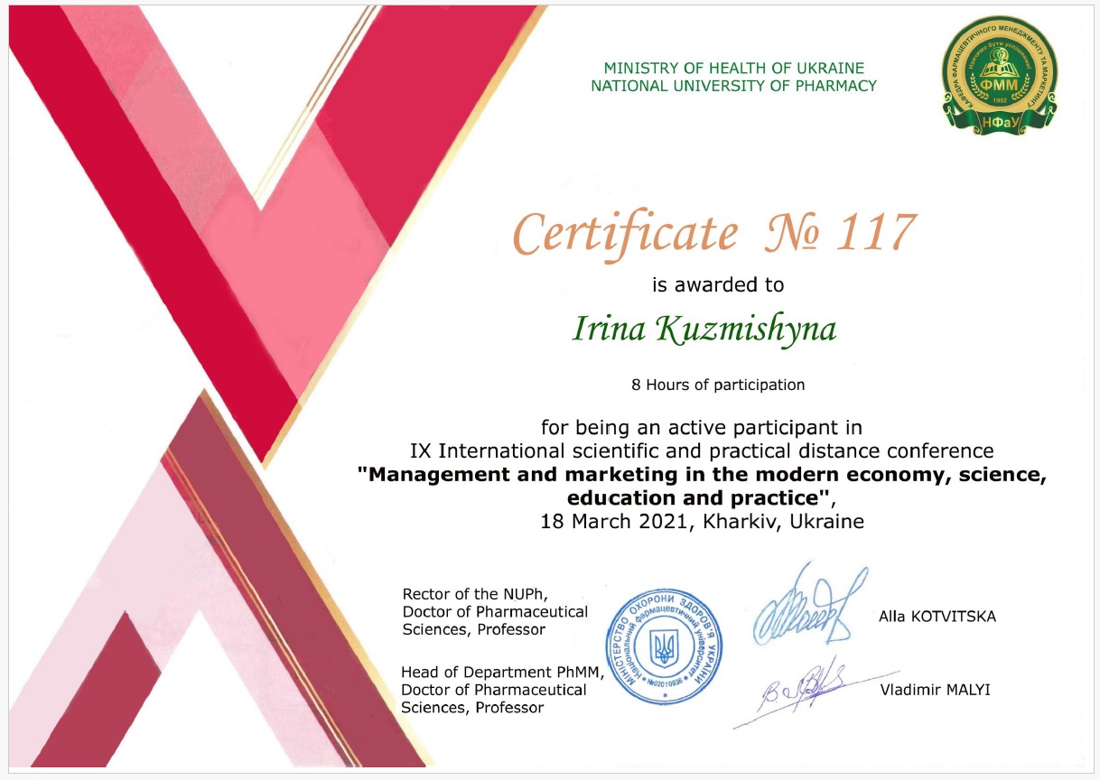 Участь у IX Міжнародній науково-практичній дистанційній конференції «Менеджмент та маркетинг в сучасній економіці, науці, освіті та практиці»]
