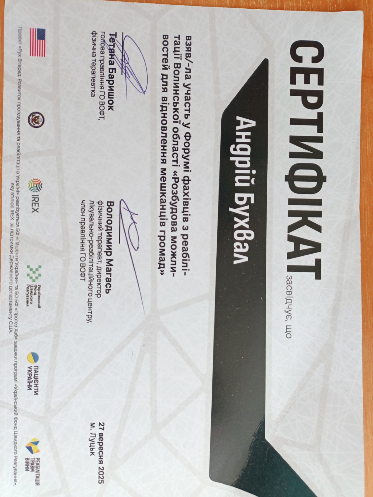 12-13 вересня 2025р – Всеукраїнський конгрес з фізичної терапії 2025 «Передовий досвід для розвитку фізичної терапії у воєнний та повоєнний час.» (Сертифікат)
