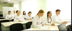 Educational classroom No. 101 is functionally divided into 2 departments: educational and practical. The educational part is equipped with workplaces for students and a teacher, supplemented by a monitor with a laptop, which provide the possibility of better visualization and viewing presentations. The practical part of the classroom is equipped with equipment for examining the respiratory and cardiovascular systems. In particular, a bicycle ergometer is used to conduct an exercise tolerance test, and a modern bicycle exercise bike “Seca-cardiotest” is used for aerobic training. Additionally, the room is equipped with a stationary ultrasound machine. On which ultrasound visualization of internal organs is performed, assessment of structural and functional parameters of the heart (chamber dimensions, condition of the valve apparatus, presence of myocardial hypertrophy, assessment of its systolic function (measurement of ejection fraction)), using a linear sensor it is possible to visualize vessels and assess the thickness of the intima-media complex. When taking the Unified Qualification Exam, the office is a station for the OSKI.