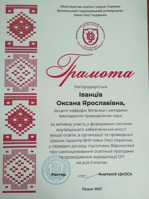 16 травня 2022 року на розширеній вченій раді Факультету біології та лісового господарства Волинського національного університету імені Лесі Українки Іванців Оксані Ярославівні було вручено грамоту за активну участь у формуванні системи внутрішнього забезпечення якості вищої освіти.