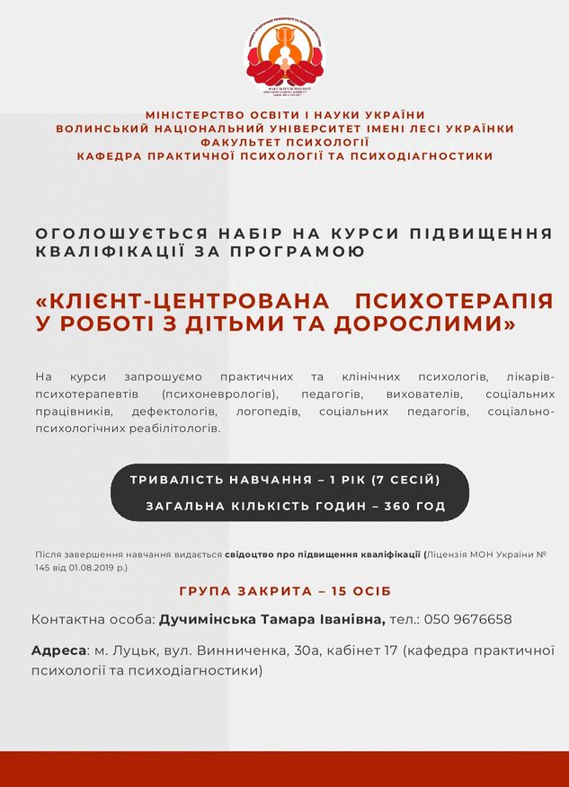 Програма сертифікатних курсів "Клієнт-центрована психотерапія у роботі з дітьми та дорослими"
