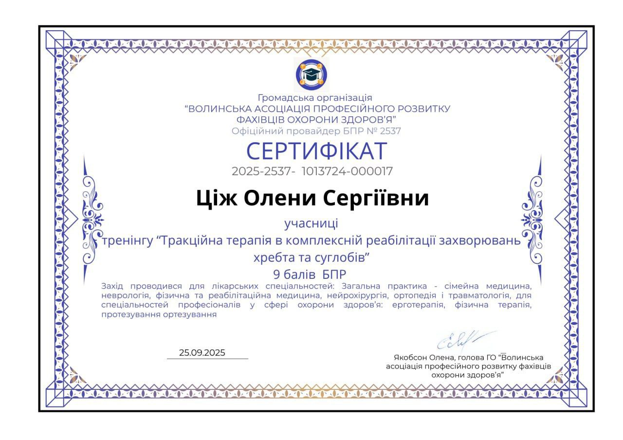 - 25 вересня 2025 - тренінг Тракційна терапія в комплексній реабілітації захворювань хребта та суглобів (Сертифікат) (9 балів БПР).
