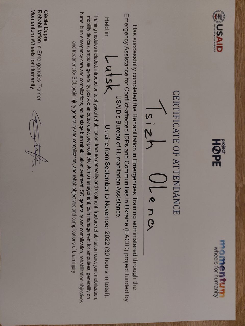 - вересень - листопад 2022 - навчання з реабілітації в рамках проекту USAID Надзвичайна допомога ВПО, постраждалим від конфлікту та громадам в Україні (Сертифікат) (30 навчальних годин).