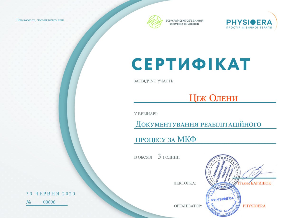 - 30 червня 2020 - участь у вебінарі Документування реабілітаційного процесу за МКФ(Сертифікат).