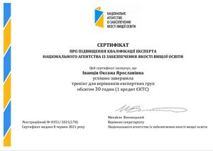 15 травня 2020 року Іванців Оксана Ярославівна була учасником науково-методичного онлайн-семінару «Вчитель біології та природничих наук в сучасному освітньому просторі».