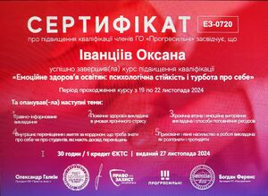 З 19 по 22 листопада 2024 року Іванців Оксана Ярославівна пройшла курс підвищення кваліфікації на онлайн-курсі «Емоційне здоров'я освітян: психологічна стійкість і турбота про себе».