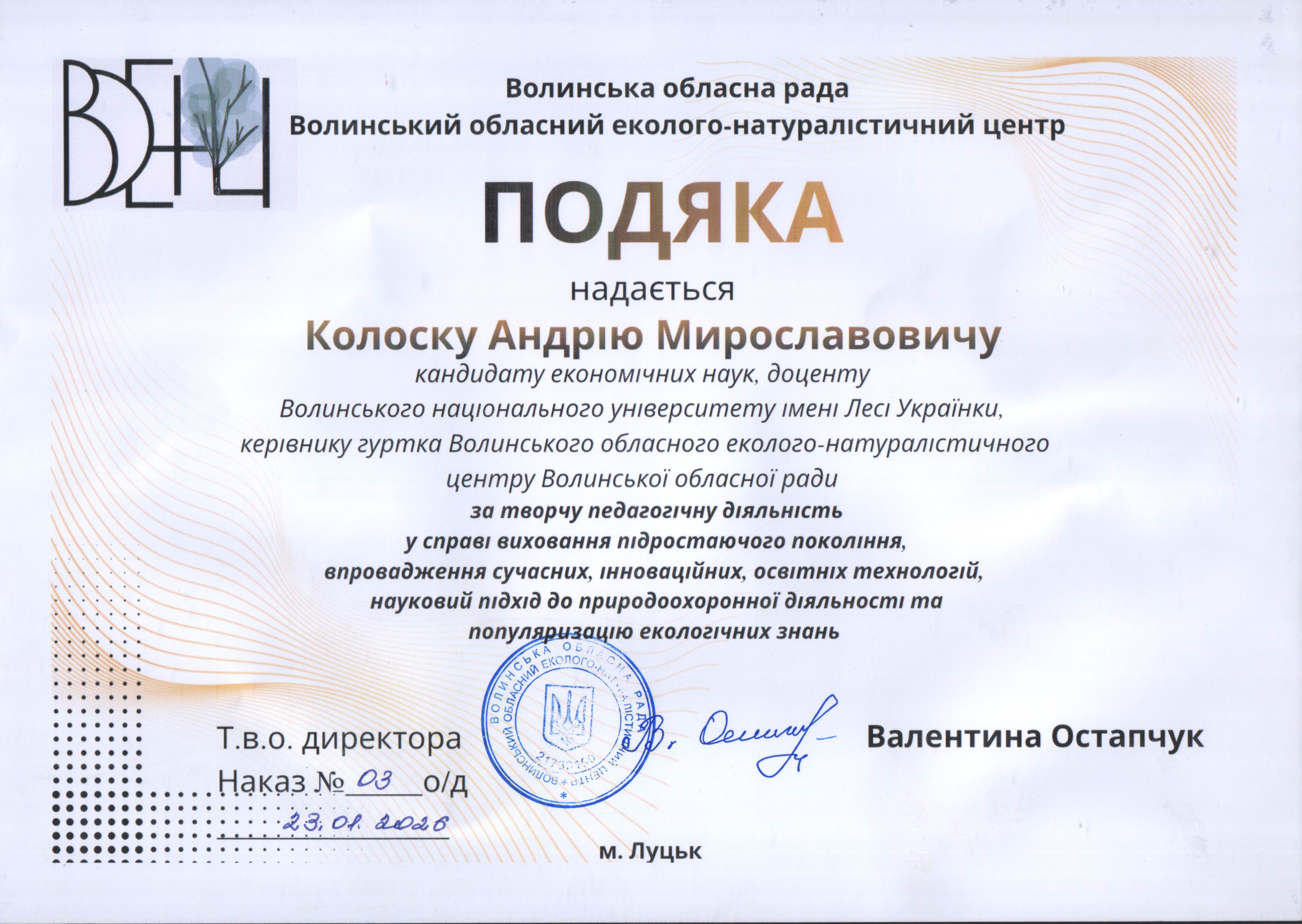 Подяка Колоску А.М. Волинського обласного еколого-натуралістичного центру «за творчу педагогічну діяльність у справі виховання підростаючого покоління, впровадження сучасних, інноваційних, освітніх технологій, науковий підхід до природоохоронної діяльності та популяризацію екологічних знань». Наказ Волинського обласного еколого-натуралістичного центру наказ № 03/о/д 23.01.2026 р.